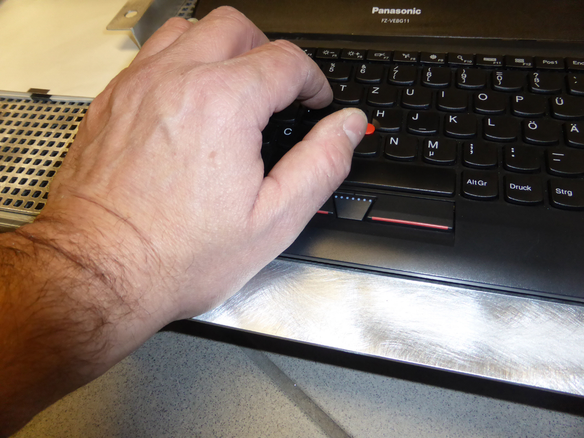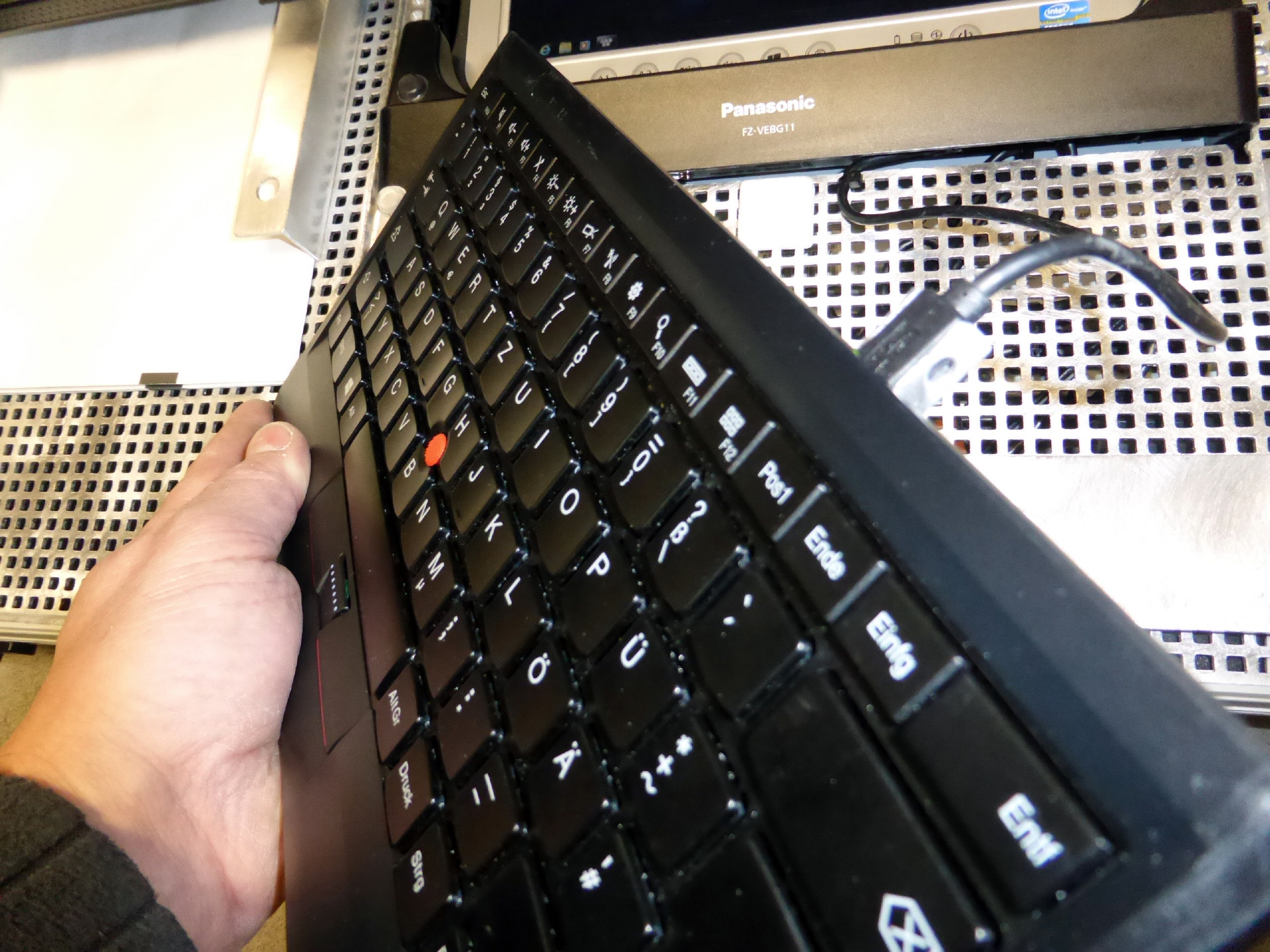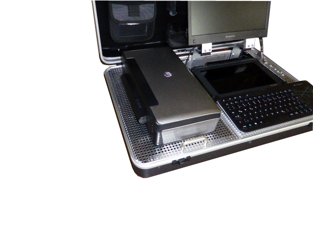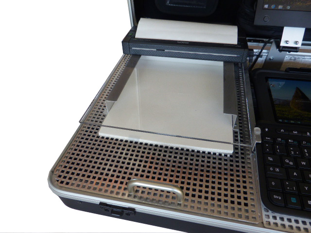 | Konfiguration Boden | Aufnahme für Drucker links mit 3M Dual-Lock-Befestigung, Aktiv-Docking-Station für Panasonic FZ-G1, Schwenkbarer Display Lenovo Thinkvision LT1421, Funktastatur Logitech mit Touchpad oder Lenovos |